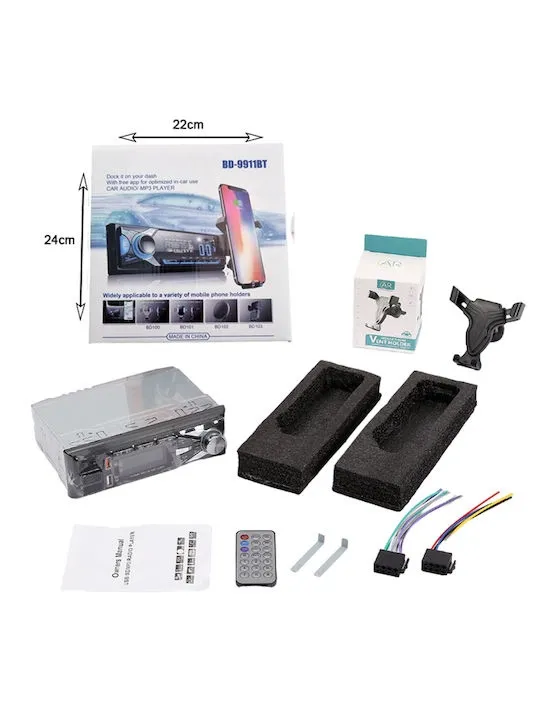 Car Audio MP3 Player Bluetooth BD-9911BT avec support, idéal pour écouter votre musique et appels en voiture. Compact, pratique et facile à installer.